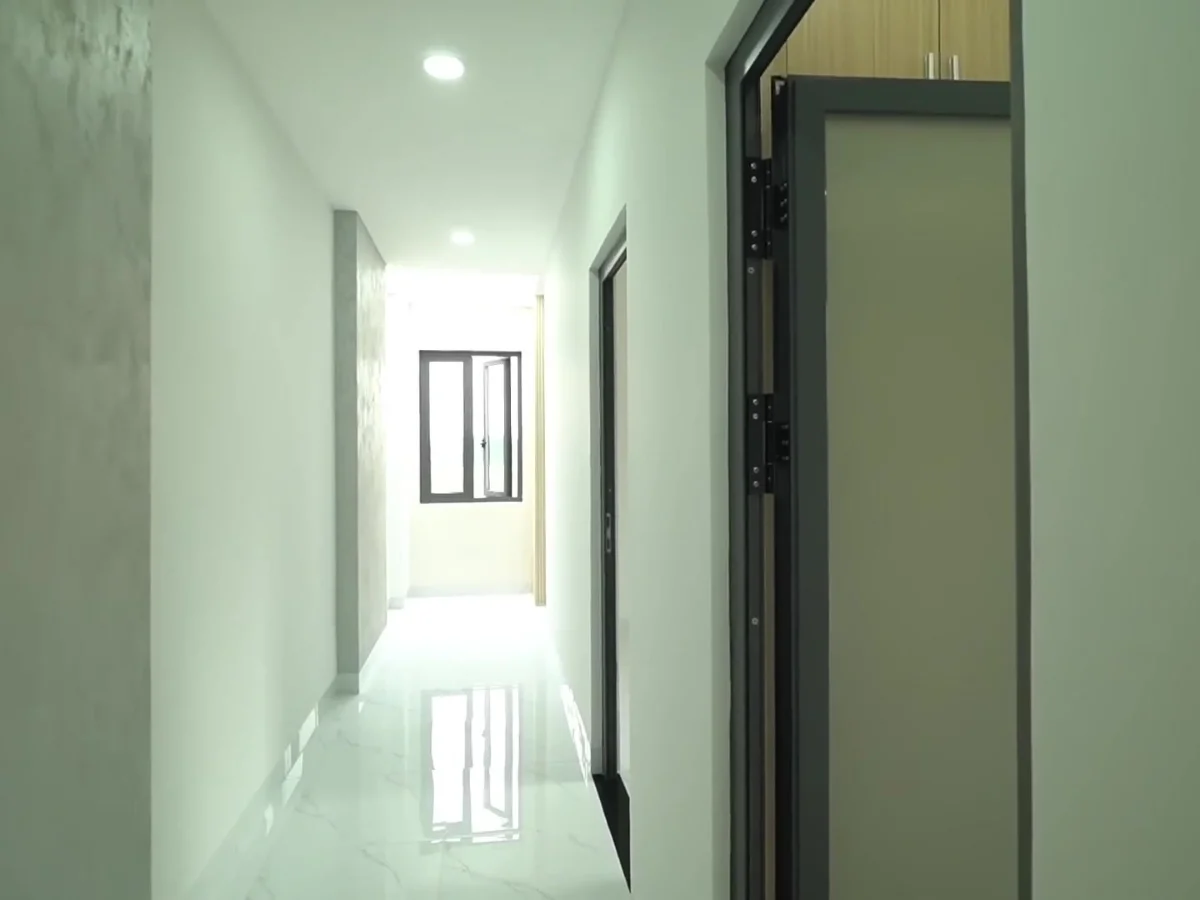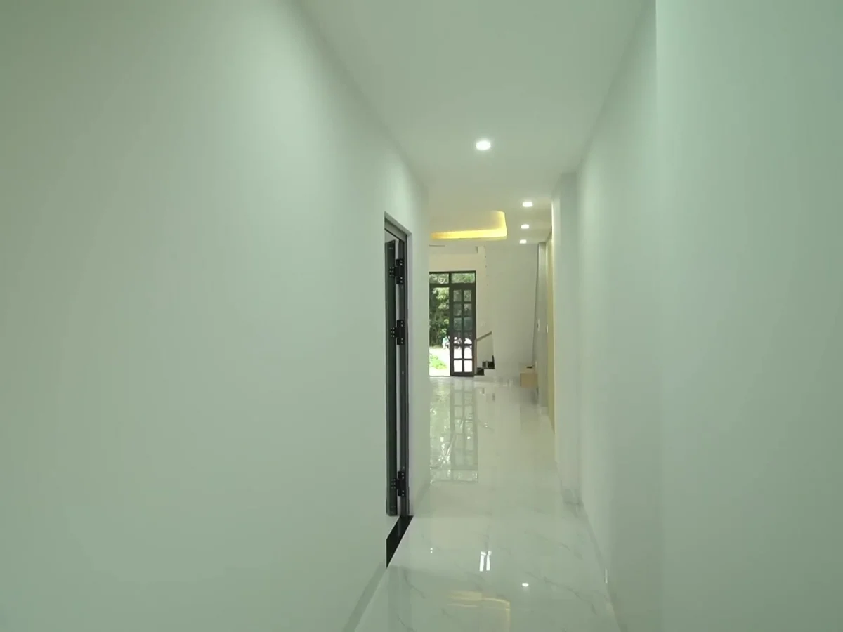 Hành lang tầng trệt rộng rãi thông thoáng, kết nối xuyên suốt cả ngôi nhà.