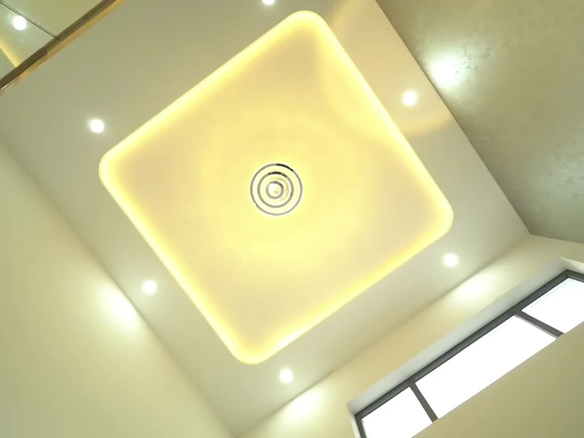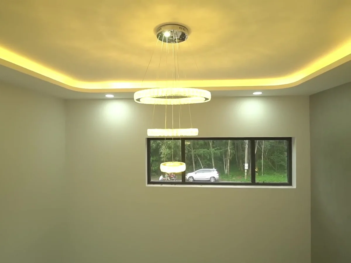 Trần thạch cao và đèn trang trí là điểm nhấn tuyệt vời cho không gian phòng khách.