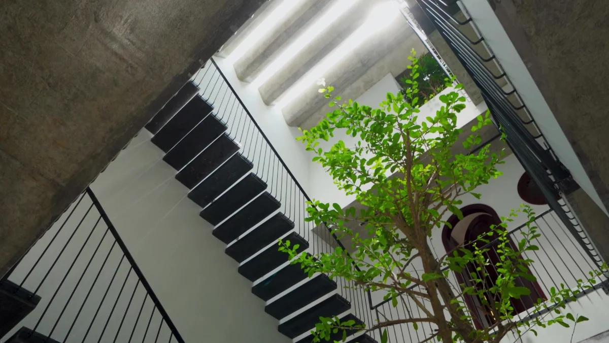 Theo một mô tuýp thiết kế nhà phố quen thuộc thì không gian cầu thang là nơi chúng ta tuyệt đối không được phép tiết kiệm bởi vì nơi này sẽ tạo cho chúng ta một cảm giác thông thoáng, thoải mái nhất. Cụ thể ở ngôi nhà phố này chúng ta thấy rất cụ thể rằng từng tia sáng chiếu rọi xuống mỗi tầng mỗi gian phòng. Cái hay của giếng trời không phải là ánh sáng bởi đèn cũng có thể chíu sáng, nhưng loại sáng từ tự nhiên nó sẽ mang theo sự ấm áp và chân thực mà không một loại thiết bị nào tạo ra được.