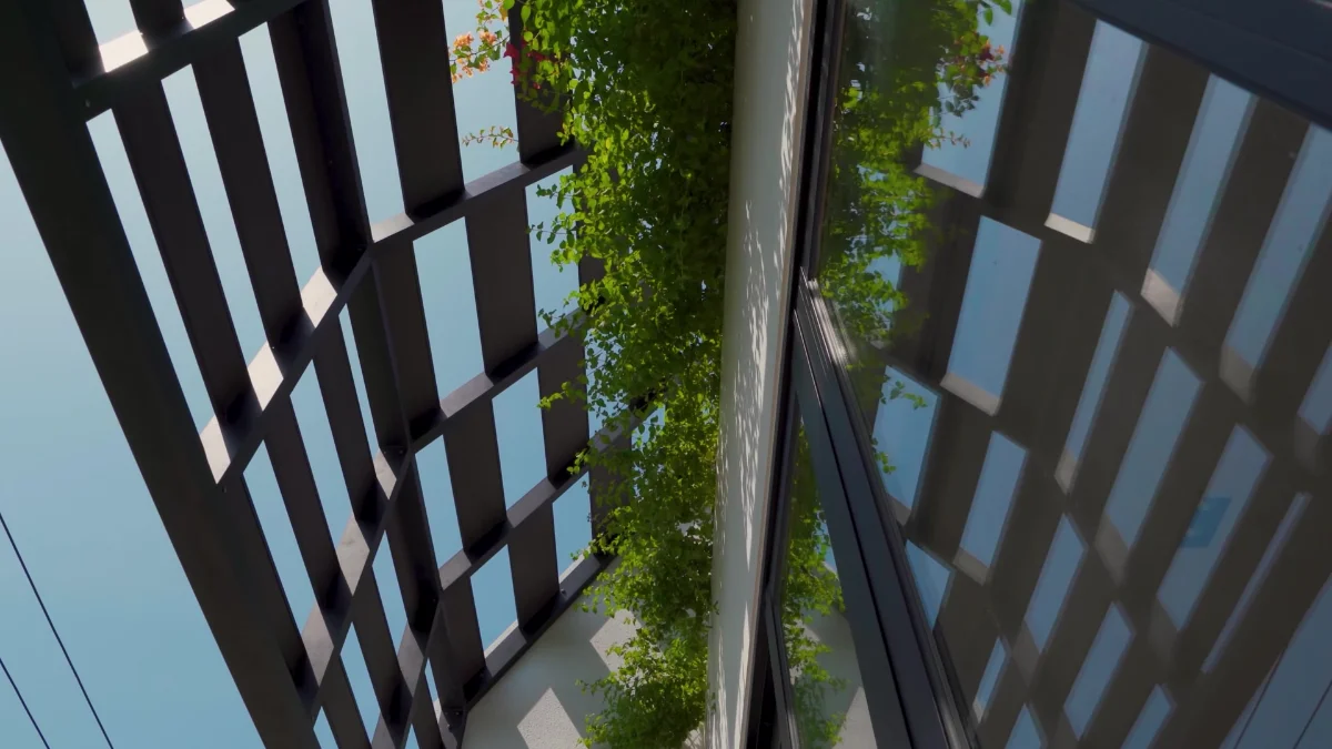 Ngôi nhà thiết kế đặc biệt với phần vòm trên cùng tựa như một cái nón, đồng thời với những tấm kim loại đan vào nhau tạo cảm giác vừa cứng cáp vừa uyền chuyển. Bên cạnh đó gia chủ còn có một sự yêu thích đặc biệt với loài hoa giấy tím khi mà loài hoa này xuất hiện dày đặc từ trong ra ngoài ngôi nhà.
