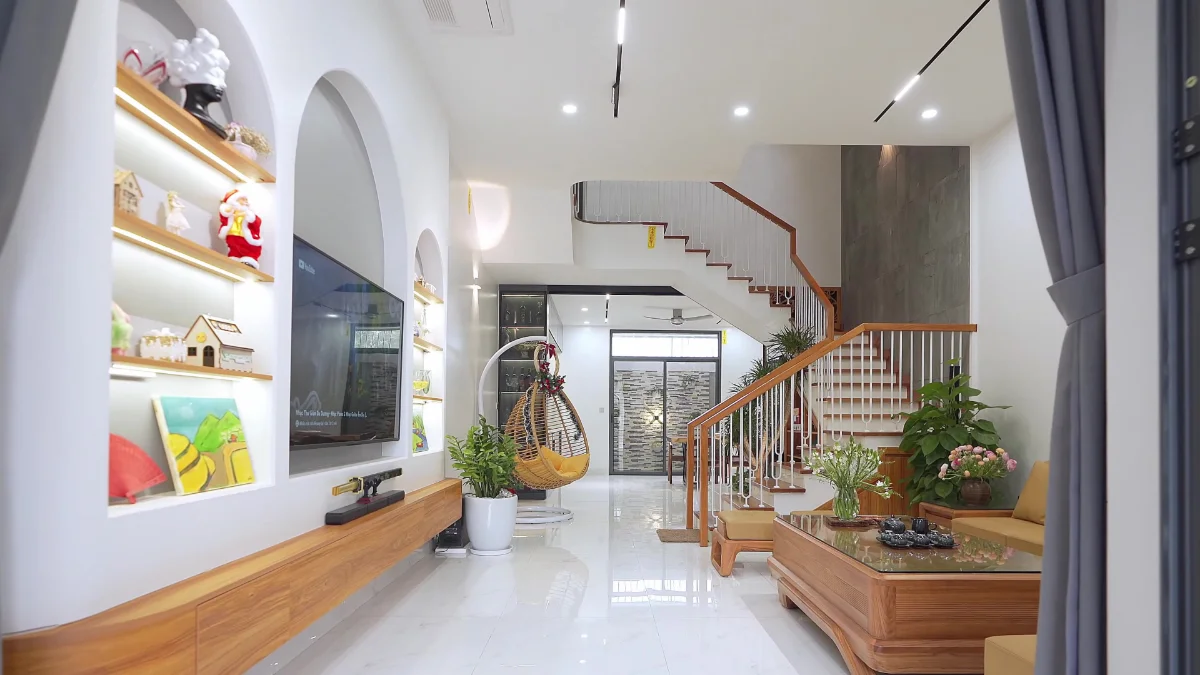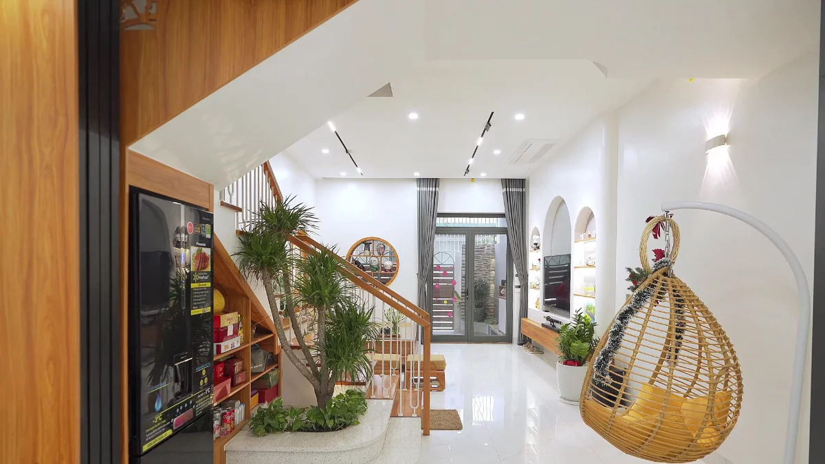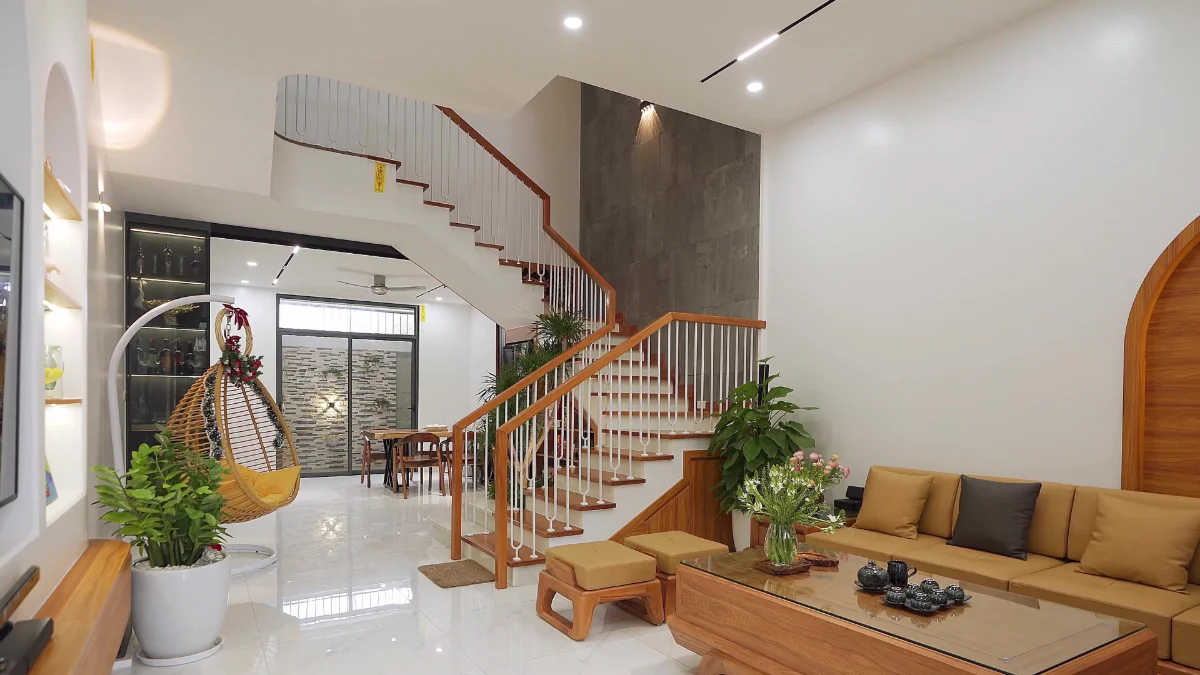 Phòng khách được bố trí đơn giản với nội thất tối thiểu để khiến không gian trở nên rộng rãi hơn. Bên cạnh đó tông màu nhẹ phối cùng lát nền vân gỗ tạo cho gia chủ cảm giác nhẹ nhàng, ấm áp. Ngoài ra, việc sử dụng ít nội thất cũng tiết kiệm nhìu chi phí để bổ sung cho những khu vực cần thiết khác.