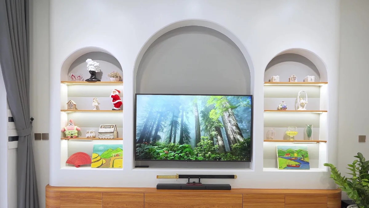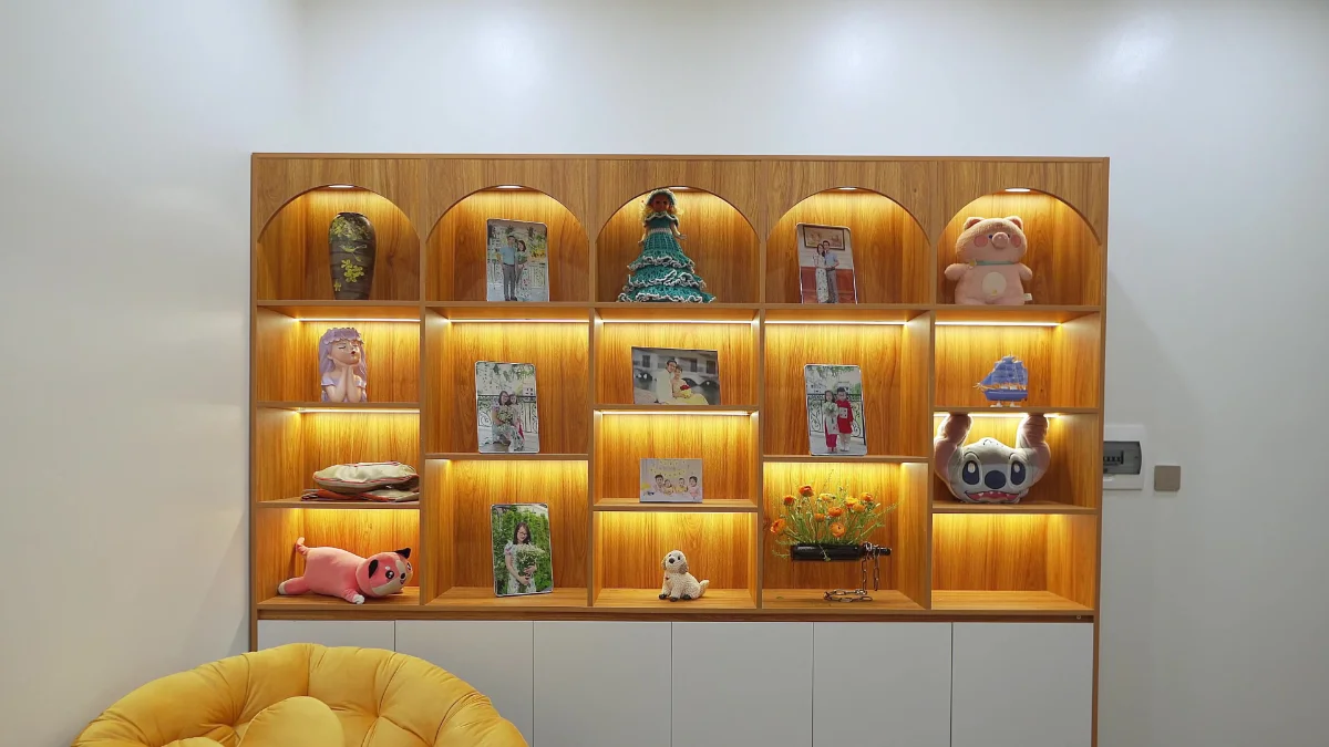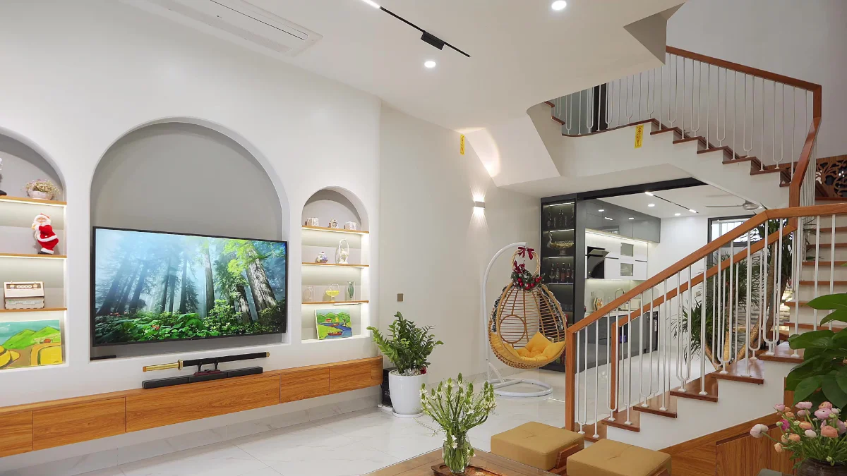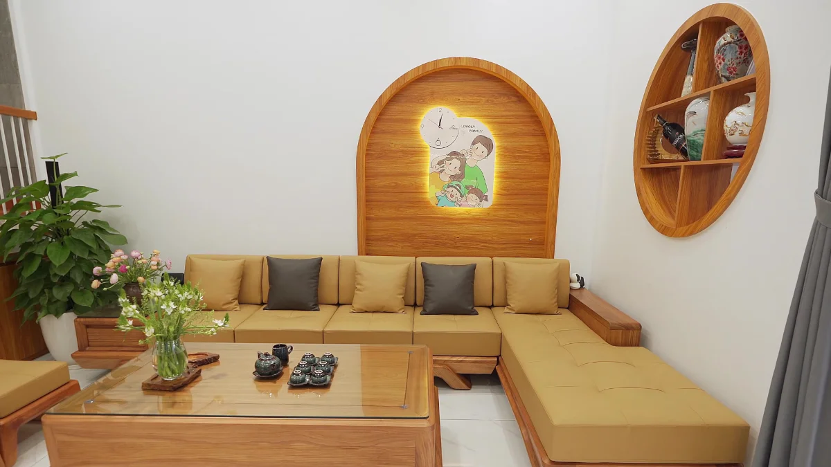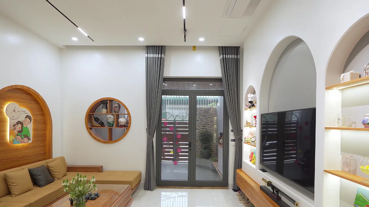Phòng khách nhẹ nhàng đơn giản với trang trí ấm áp gia đình.