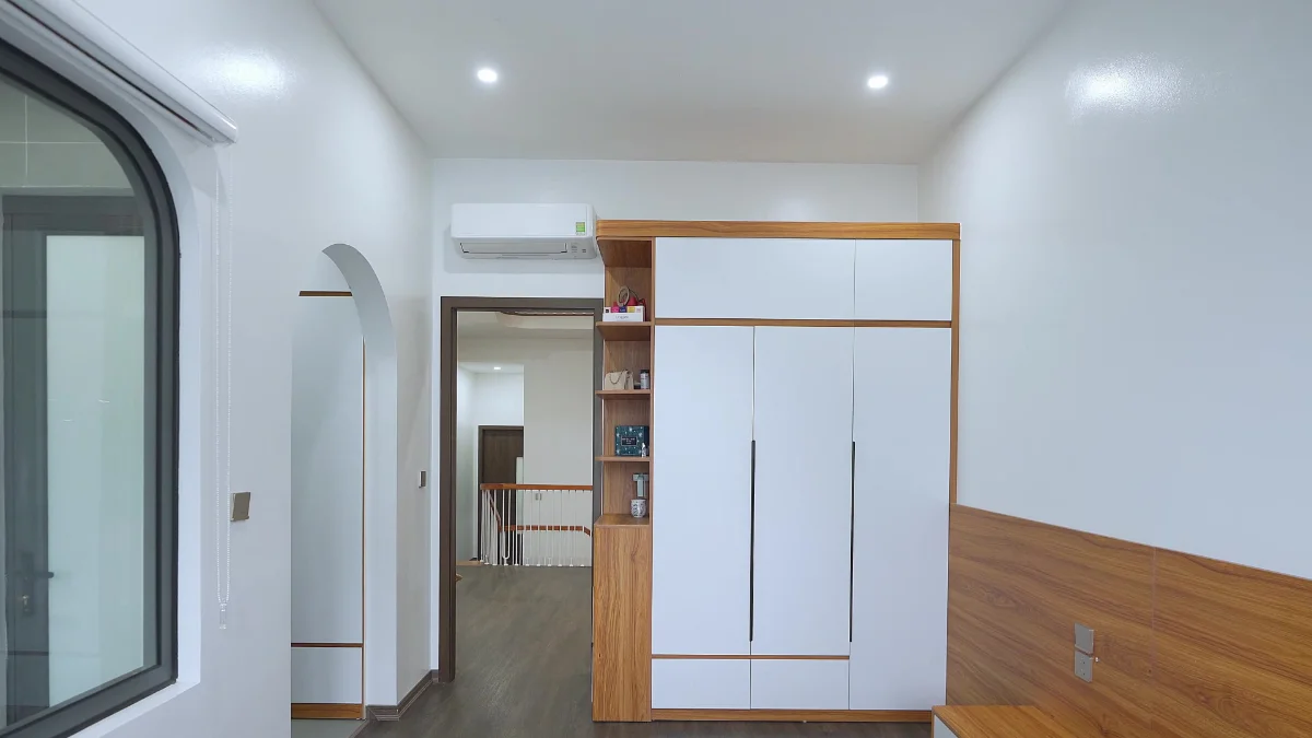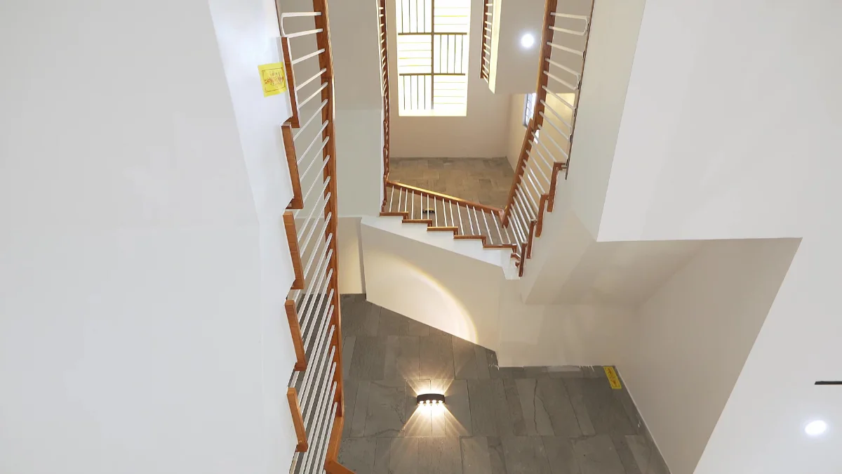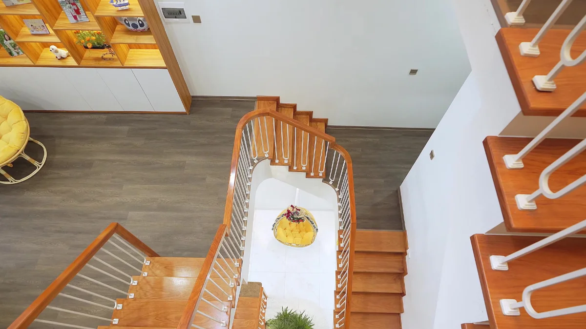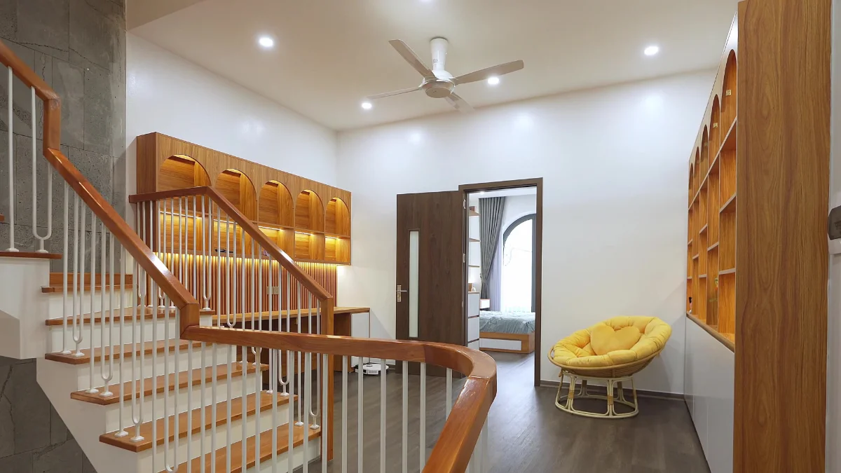 Theo yêu cầu của gia chủ về một không gian tràn ngập ánh sáng và ấm áp, đội ngũ thiết kế đã tinh tế sử dụng kết hợp tông mà gỗ đậm và trắng, với màu gỗ đậm tạo cảm giác ấm áp gia đình và màu trắng làm ngôi nhà trở nên tươi sáng hơn bao giờ hết. Đồng thời, hệ thống chiếu sáng cũng được bố trí cực kỳ hiệu quả với những đèn led và đèn trang trí khắp mọi ngóc ngách ngôi nhà, với tiêu chí không có điểm khuất sáng. Tuy nhiên, chỉ ánh sáng đèn thì nó không tạo cho con người ta cảm giác chân thật, vì thế chúng ta đã bố trí không gian lấy sáng ở cầu thang với diện tích khá lớn, điều này đem đến một lượng ánh sáng tự nhiên đủ lớn để làm cho ngôi nhà trở nên sinh động và thật hơn.