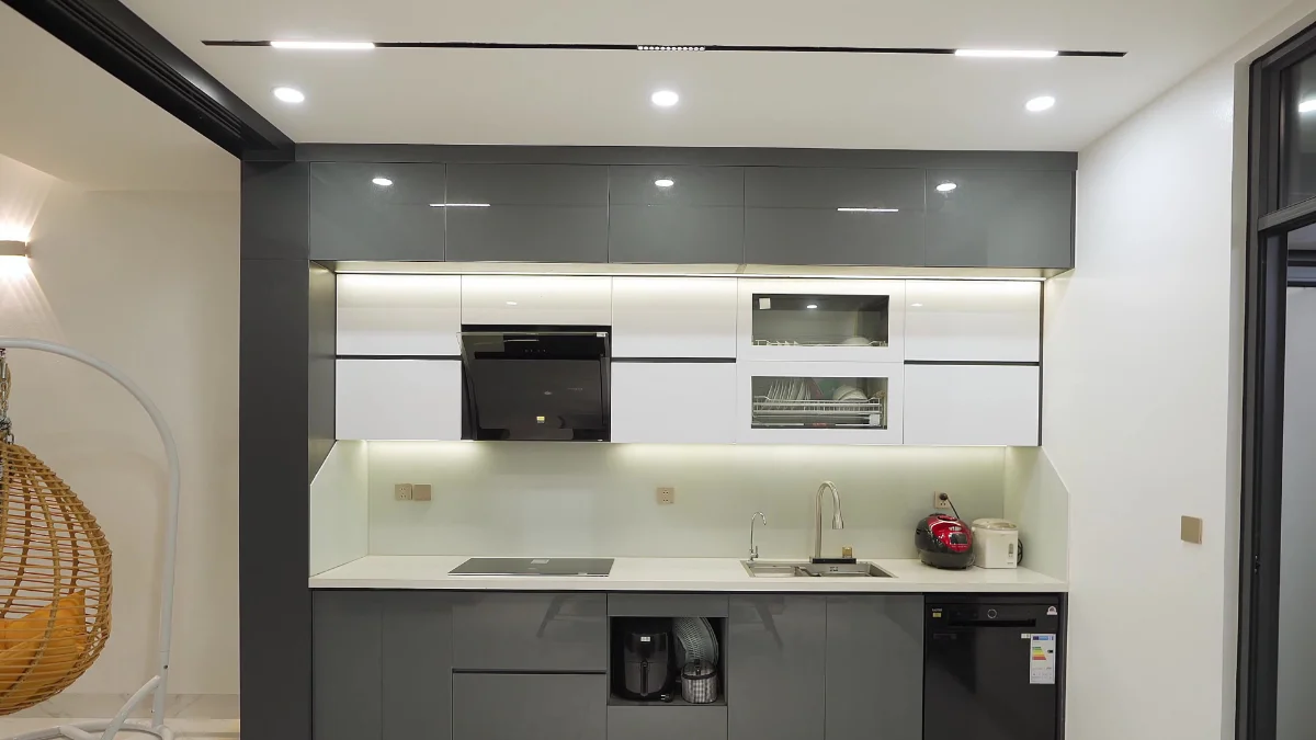 Phòng bếp nhỏ nhắn tối giản nhưng đầu đủ công năng sử dụng.