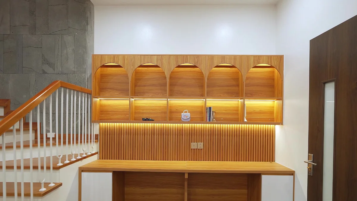 Không gian làm việc và học tập được thiết kế cạnh nhau thay vì một phòng làm việc đơn lẻ. Bởi theo yêu cầu gia chủ rằng làm việc hay học tập thì mọi người cũng cần ở cạnh nhau bởi thời gian ở bên nhau là ít ỏi và vô cùng quý giá, đôi khi chỉ cần ngồi cạnh nhau cũng đã đủ cho một sự gắn kết vô hình giữa các thành viên.