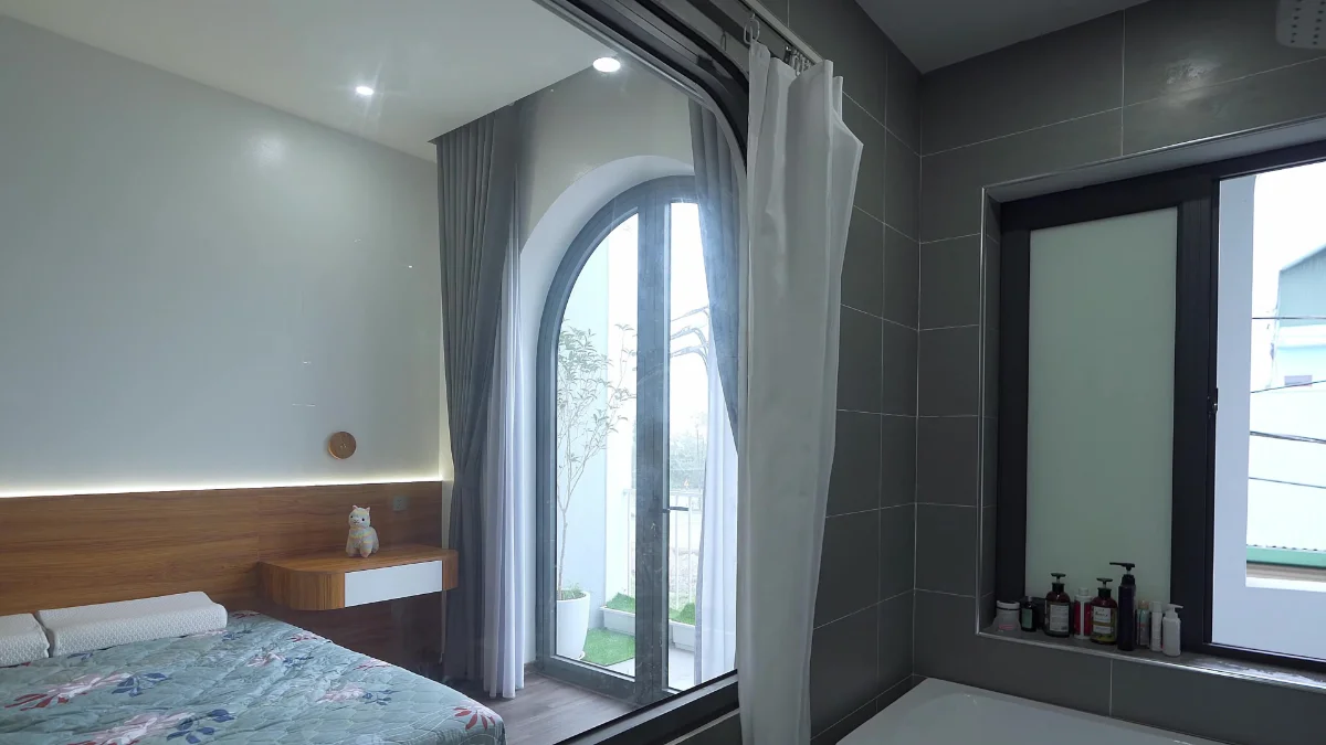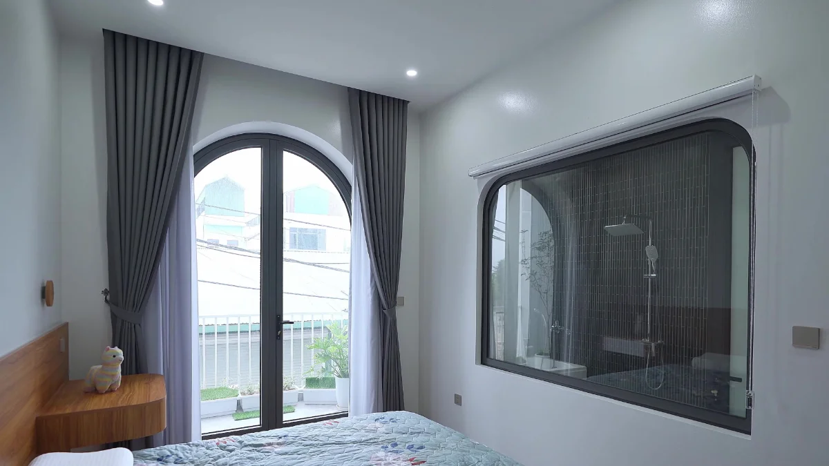 Thông thường, phòng ngủ sẽ có gắn tivi đối diện giường để giải trí. Tuy nhiên với giá trị gắn kết thì phòng ngủ sẽ không được lắp tivi, bởi vì gia chủ muốn hai vợ chồng có thể trò chuyện và dành cho nhau những thời gian ấm áp để xóa tan đi mệt mỏi, muộn phiền ngoài xã hội. Đồng thời do dành nhiều không gian cho nơi làm việc, học tập nên phòng ngủ có diện tích khá ít, để khắc phục điều này thì đối diện giường sẽ lắp kính thông với nhà vệ sinh để mở rộng không gian phòng ngủ, moi người cũng đừng lo ngại những vẫn đề riêng tư vì đã có rèm kéo sử dụng.
