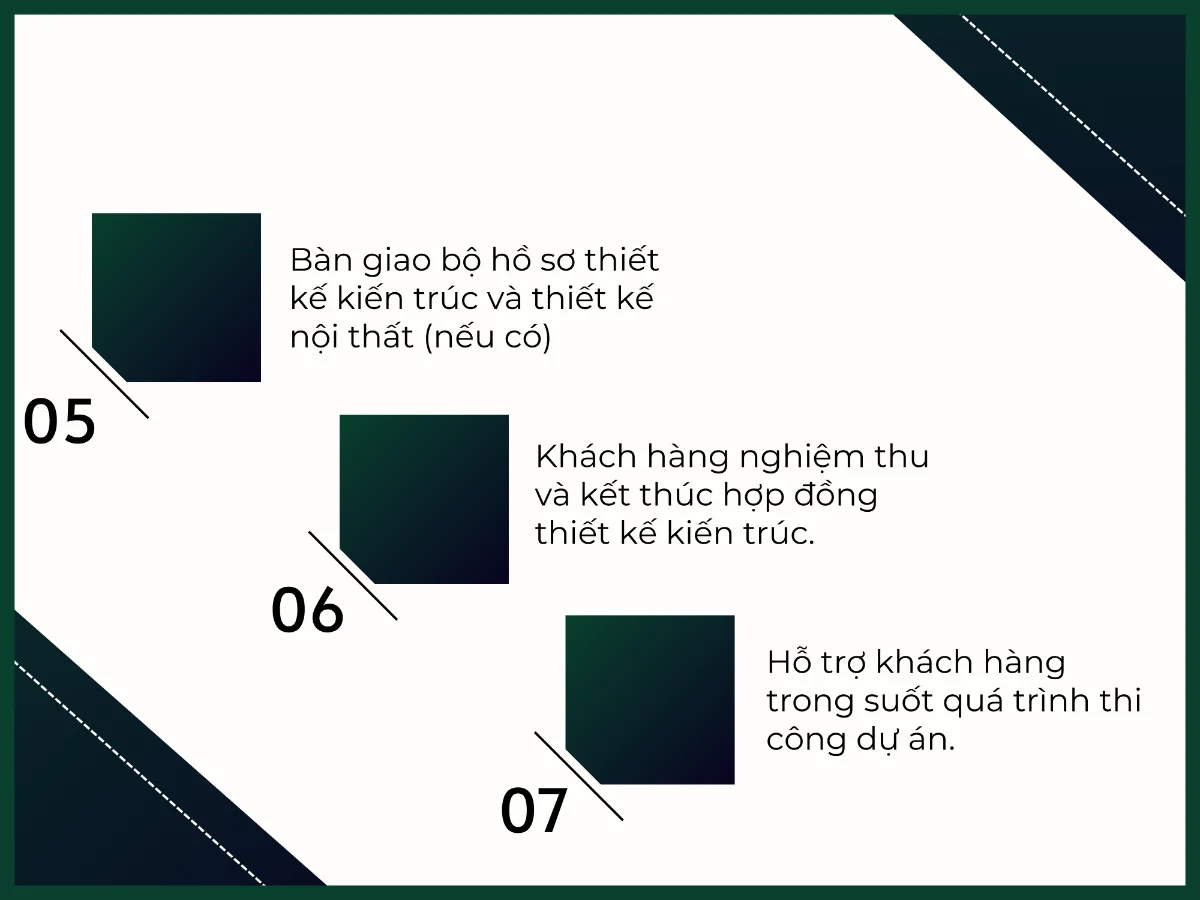- Bước 6: Khách hàng nghiệm thu và kết thúc hợp đồng thiết kế kiến trúc.